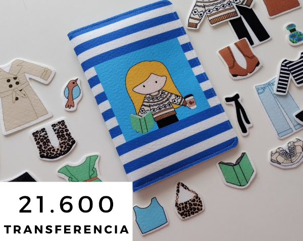 La Viajerita mide 21x15 cerrada, Tiene dos bolsillos donde guardás todas las piecitas. El simple roce de fieltro con fieltro hace que las prendas se queden en su lugar.