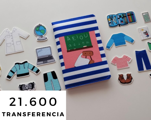 Mide 21x15 cerrada, Tiene dos bolsillos donde guardás todas las piecitas. El simple roce de fieltro con fieltro hace que las prendas se queden en su lugar.